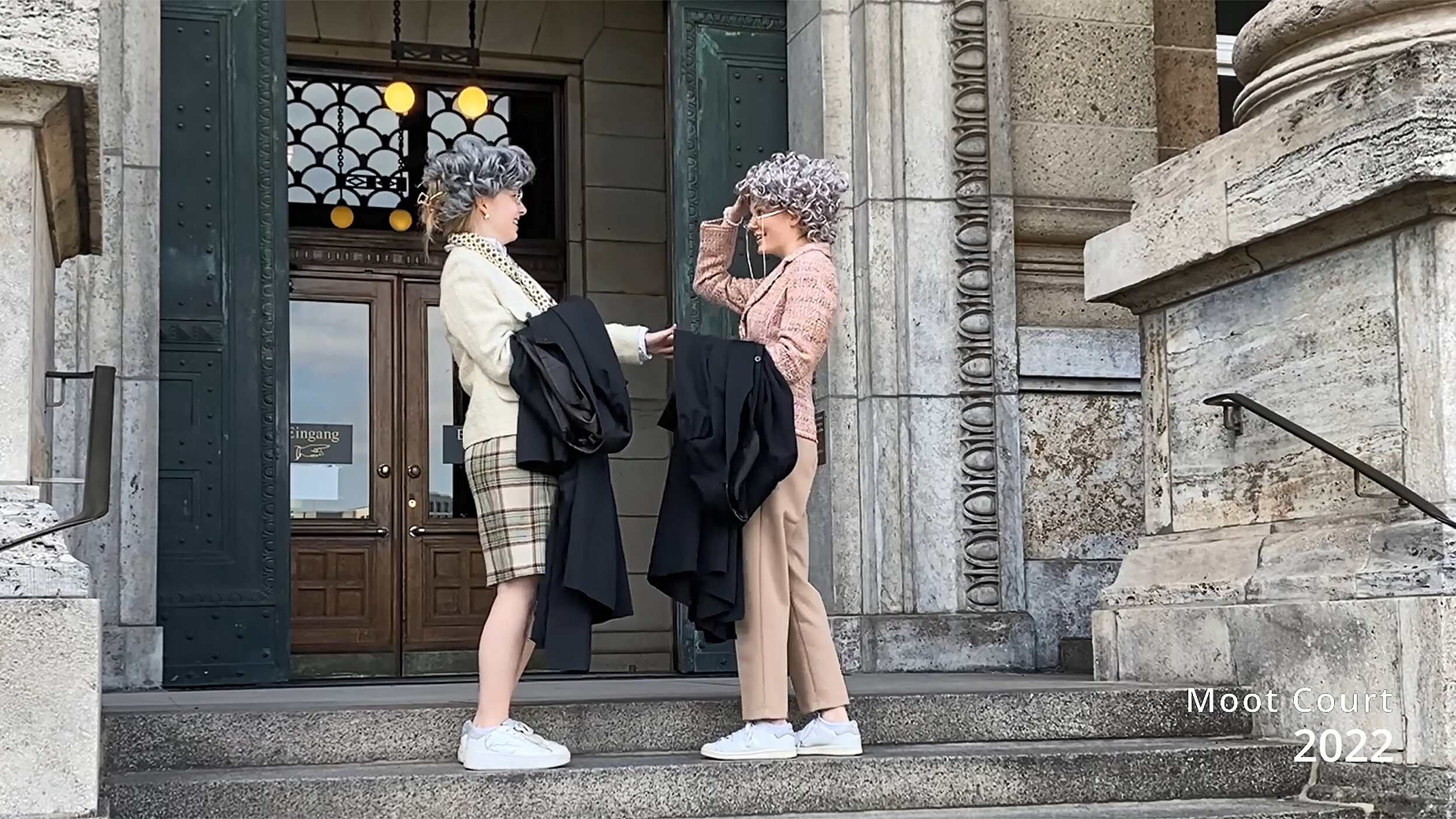 An den EDMC wird man sich noch lange erinnern. Das zeigen Julia Burmeister und Henriette Klostermeyer (beide Universität Hamburg) in ihrem kreativen Kurzfilm, der im EDMC-Videowettbewerb von ELSA Deutschland und GvW den ersten Platz erzielt hat. Wie ist der Zufall so will, treffen sich beide im fortgeschrittenen Alter vor dem Gerichtsgebäude und denken an die schöne Zeit des gemeinsamen Moot Courts zurück...