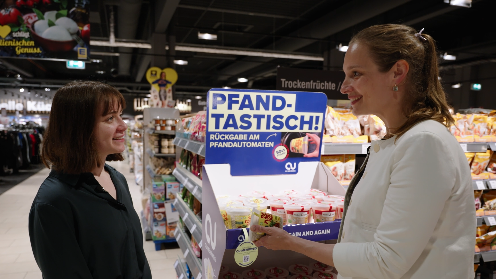 CU AGAIN statt Gelber Sack: So lautet das Motto des Mannheimer Startups CU Mehrweg. Mit ihrer selbst entwickelten CU-Box bietet es Handelsmarken eine Verpackung an, die immer wieder neu befüllt werden kann. Das Versprechen „leicht, langlebig und wiederverschließbar“ überzeugt Unternehmen wie Seeberger, Sunflowerfamily GmbH oder Müller's Mühle GmbH, die die CU-Box für ihr Sortiment bereits nutzen. Dr. Stefanie Ramsauer ist Fachanwältin für Verwaltungsrecht bei GvW und hat CU Mehrweg seit ihrer Gründung im Verpackungsrecht beraten. Wir sind in einem Marktkauf in Weinheim, um uns von Unternehmensgründerin und Geschäftsführerin Tatiana Tsarkova das Produkt und den Produktkreislauf zeigen zu lassen.